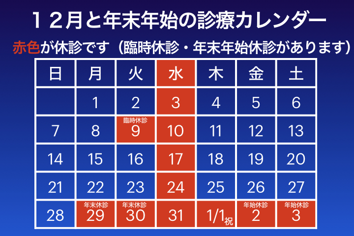 12月と年末年始の診療カレンダー 2025/11/28 お知らせ 休診 季節 12月9日(火)は臨時休診です。 12月29日(月)〜1月3日(土)は年末・年始休診です。 1月4日(日)から通常の診療です。